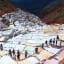 Next, around 11:00 AM, we’ll visit the famous Maras Salt Mines—a stunning network of over 3,000 shallow salt pools that have been in use since pre-Inca times. Managed by about 380 local families, these pools are fed by a natural salty spring that flows from the nearby mountain known as Qoripukiu, meaning "golden spring" in Quechua. The striking white pools surrounded by mountain scenery create a truly unforgettable view.